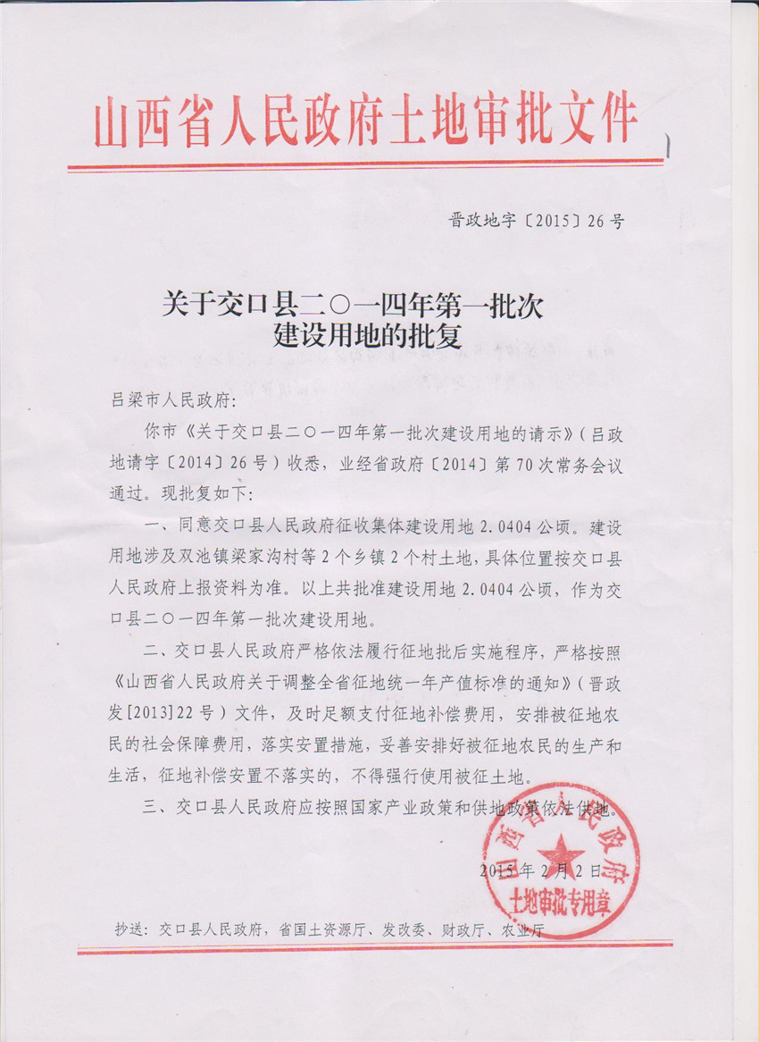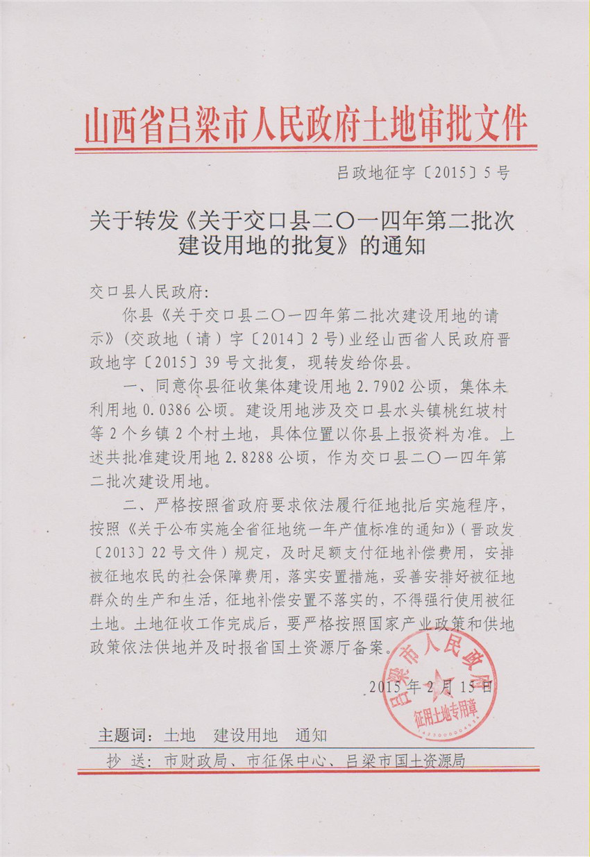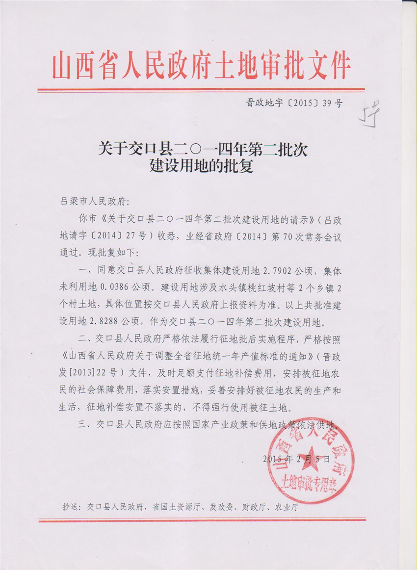 关于交口县2014年第2批次建设用地的批复 |