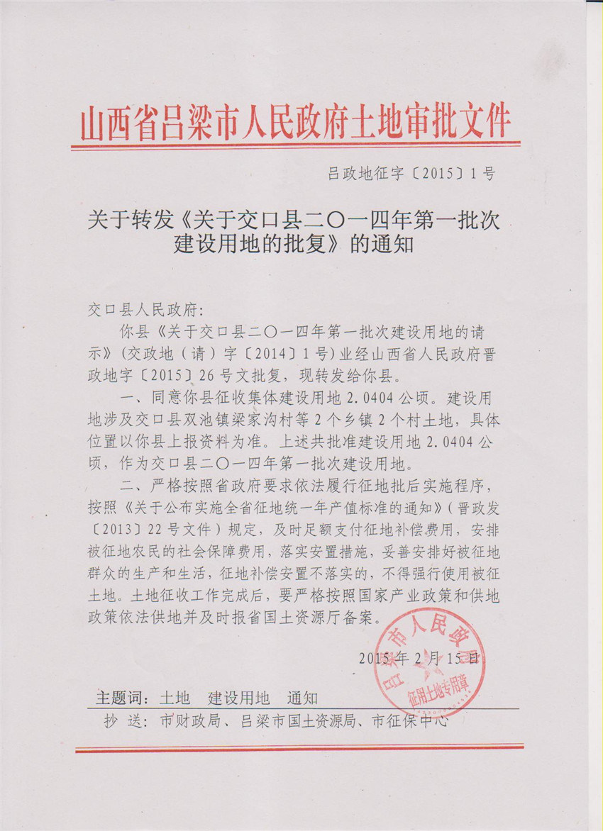 关于交口县2014年第1批次建设用地的批复 |