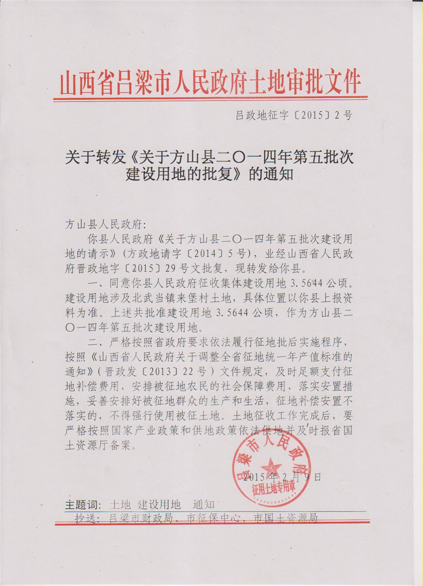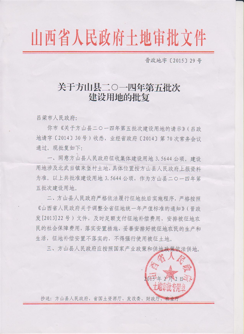 关于方山县2014年第5批次建设用地的批复 |