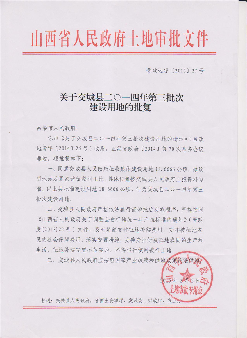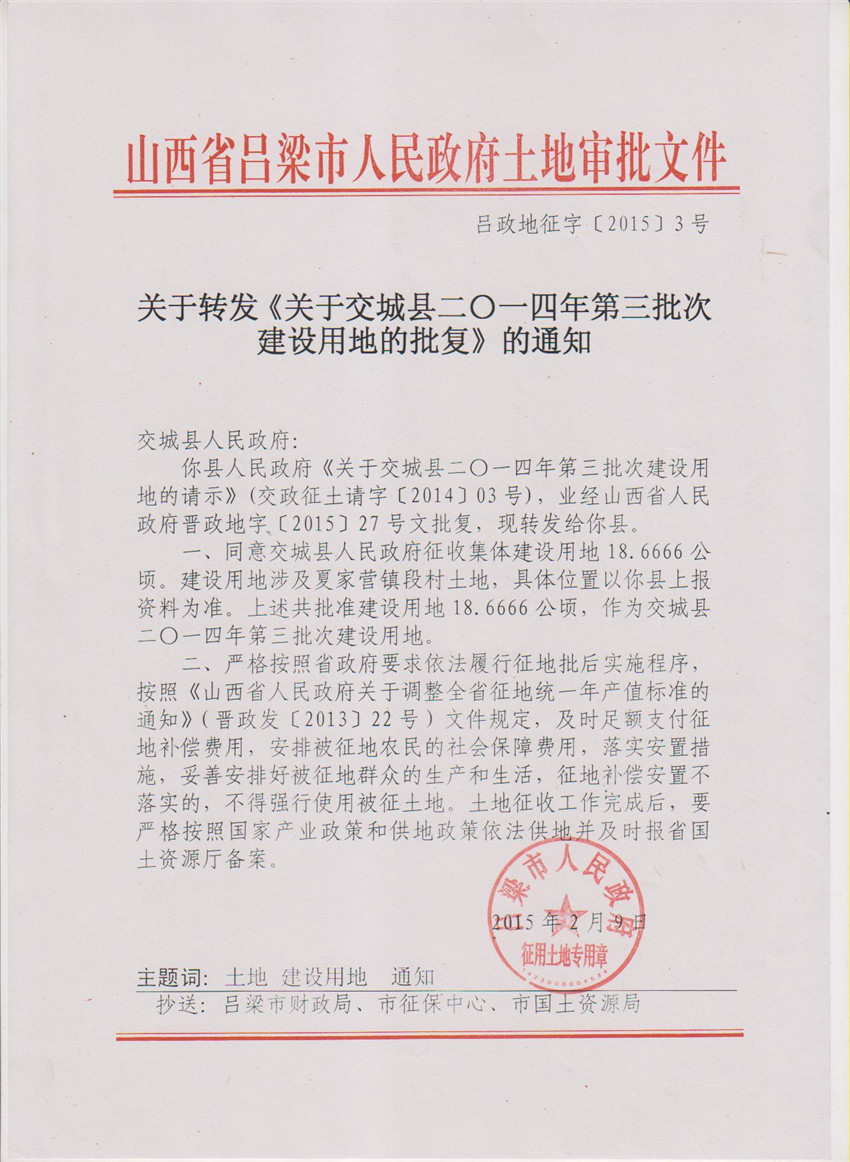 关于交城县2014年第3批次建设用地的批复 |