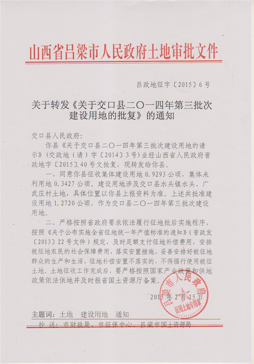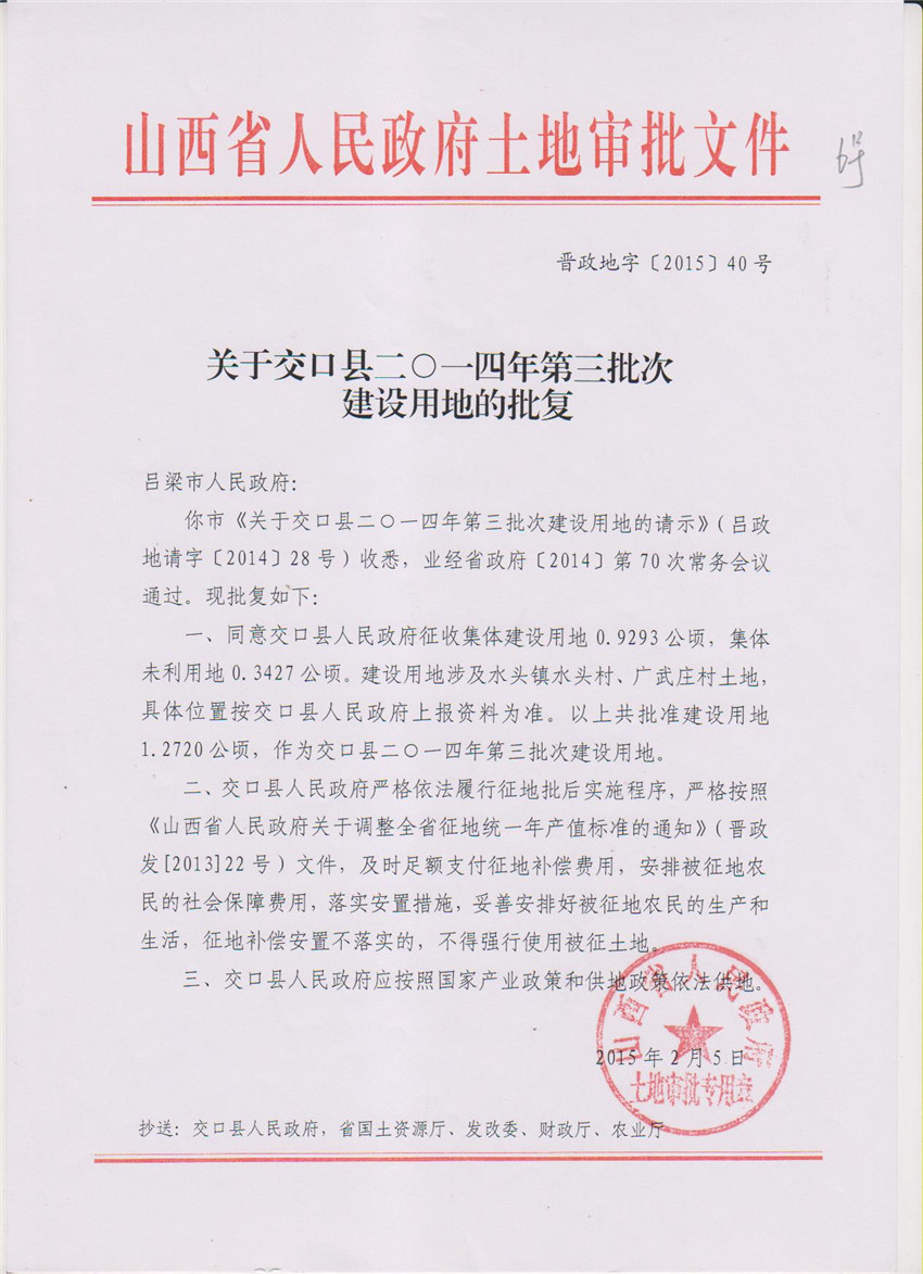 关于交口县2014年第3批次建设用地的批复 |