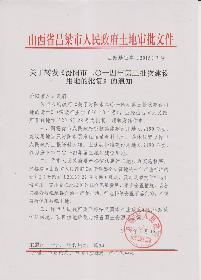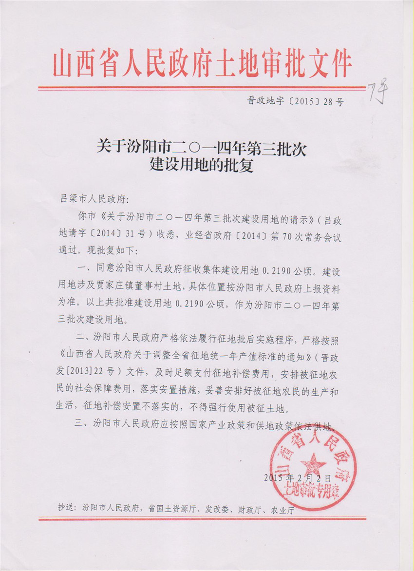关于汾阳市2014年第3批次建设用地的批复 |