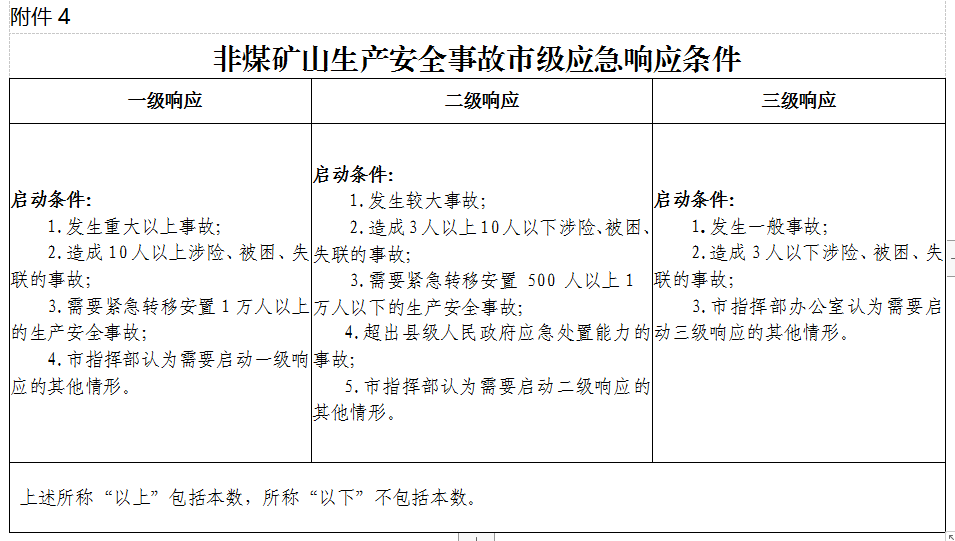 市级响应由低到高设定为三级、二级、一级三个等级。非煤矿山生产安全事故发生后,依据响应条件,启动相应等级响应 (各等级响应条件见附件4)。