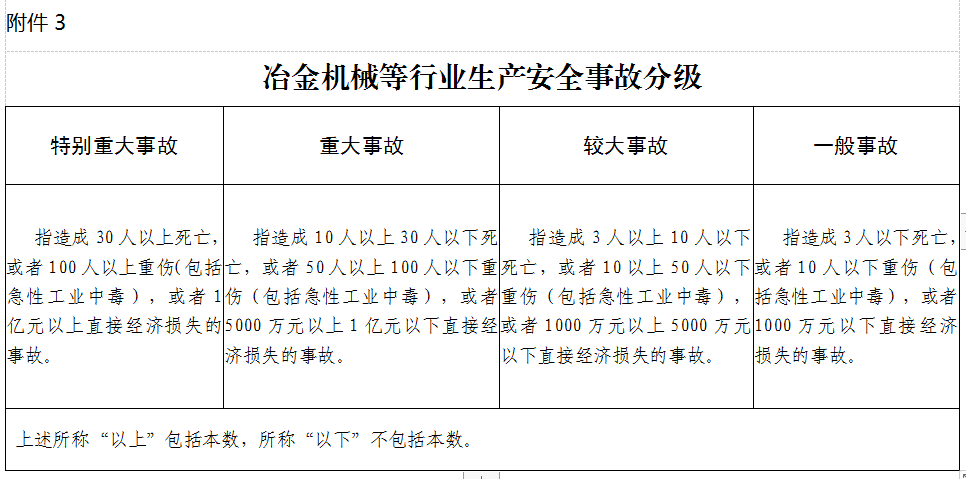 依根据《生产安全事故报告和调查处理条例》规定,冶金机械等行业生产安全事故分为特别重大、重大、较大、一般事故四个等级,详见附件3。