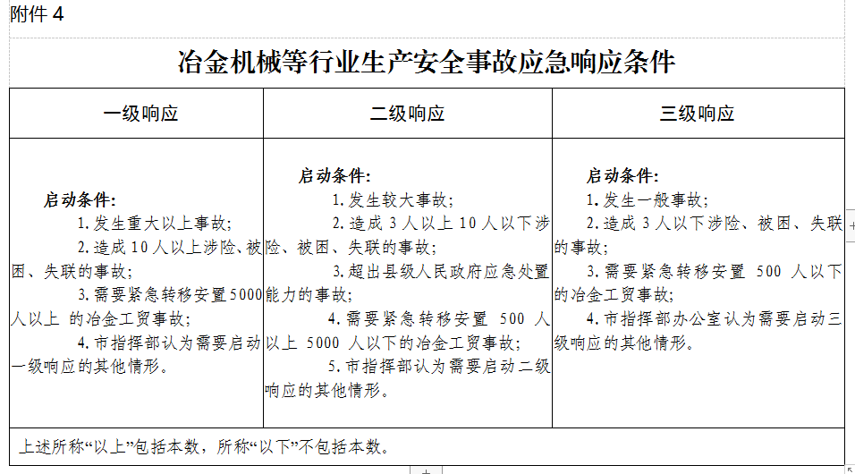 市级响应由低到高设定为三级、二级、一级三个等级。冶金机械等行业事故发生后,依据响应条件,启动相应等级响应(各等级响应条件见附件4)。