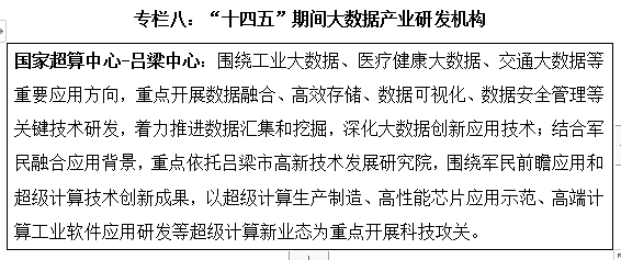重点依托吕梁市高新技术发展研究院与华为山西(吕梁)大数据中心,建立完善“1+N”政策服务体系,搭建“一区三园”产业发展载体,构建“一委三院”人才支撑体系,建设“一网多用”融合发展格局,精心打造“数谷吕梁”。加强算能建设,深化与相关高校和科研机构合作,推进“天河二号”改进升级,不断提高超算中心的质量和水平,将超算中心建成“数谷吕梁”的重要引擎,到2022年建成国家超级计算(吕梁)中心。面向山西特色产业和行业需求,依托超算中心发展大数据相关产业,为区域内高端装备智能制造、煤化工及精细化工产业、能源产业、电子信息制造业、生物医药业、有色金属冶炼等产业转型升级赋能,切实发挥超算在国家基础创新领域的重要支撑作用。