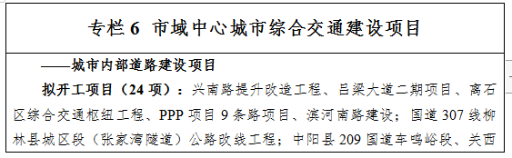 加大农村公路建设力度。项目总投资77亿,农村公路建设3985公里,安全生命防护工程321公里,项目包括公路建设、安全生命防护工程、危桥危隧改造等内容。其中,方山县从农村公路提档改造、健全交通安全设施、提升自然村通达通畅度三个方面开展乡村公路提升改造。在农村公路提档改造方面,将重要县乡道提升至二级、三级标准,完成县乡道改造83.92公里,完成村道改造88.95公里。在健全交通安全设施方面,完成县乡道公路生命安全隐患治理29.40公里,完成村道公路生命安全隐患治理13.80公里。在提升自然村通达通畅度方面,新建村道54.40公里,总里程达到390.42公里。