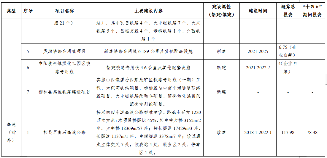 强化区域交通先导作用,建设五纵九横公路网。着力完成兴县至岚县至太佳高速、柳林至大武至文水、中阳至孝义至介休、石楼至交口至孝义的四条高速通道,完善区域交通体系,带动区域发展。推进静兴高速公路建设,完成投资22.7亿元,完成建成通车;加快祁离高速建设,完成投资25亿元;加快离隰高速建设,完成投资32亿元;汾石高速开工,完成投资20亿元;加快国道209项目建设,完成投资20亿元,力争路基桥涵全线贯通;方山新建起于麻地会乡老G209,向东经古交市接入太古高速的高速,加快339国道提级改造。“十四五”末,基本构建“中心城市辐射区域、地市便捷连接、市县互相连通、重要乡镇覆盖”的国省道干线公路网。