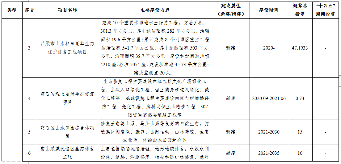 修复生态退化地区。按照《吕梁市生态修复城市修补规划》,有计划有步骤地修复被破坏的山体、河流、湿地、植被、采矿废弃地。实施水环境综合治理工作,开展以控源截污为基础的城市水体生态修复,改善水体水质,城市地表水Ⅳ类及以上水体比例≥50%。对河道综合改造的水体岸线实施自然化生态驳岸建设,力争自然水体的岸线自然化率≥80%。完成城市建成区内黑臭水体的长治久清评估工作。加强水土保持与流域治理。坚持“因地制宜、综合治理”的原则,开展侵蚀沟治理、坡耕地综合治理、小流域综合治理、特色小流域示范区建设、水土保持生态文明示范区建设等水土流失治理五大体系建设。合理配置工程、林草、耕作等措施,形成综合治理体系,维护和增强区域水土保持功能。加强矿山地质环境保护与生态恢复。根据矿山地质环境治理要求,积极开展地质灾害治理,全面推进采煤沉陷区、采空区、水土流失区、煤歼石山、工业固废贮存场所的生态环境治理和修复重点工程。到2025年历史遗留矿山环境综合治理率达到65%。