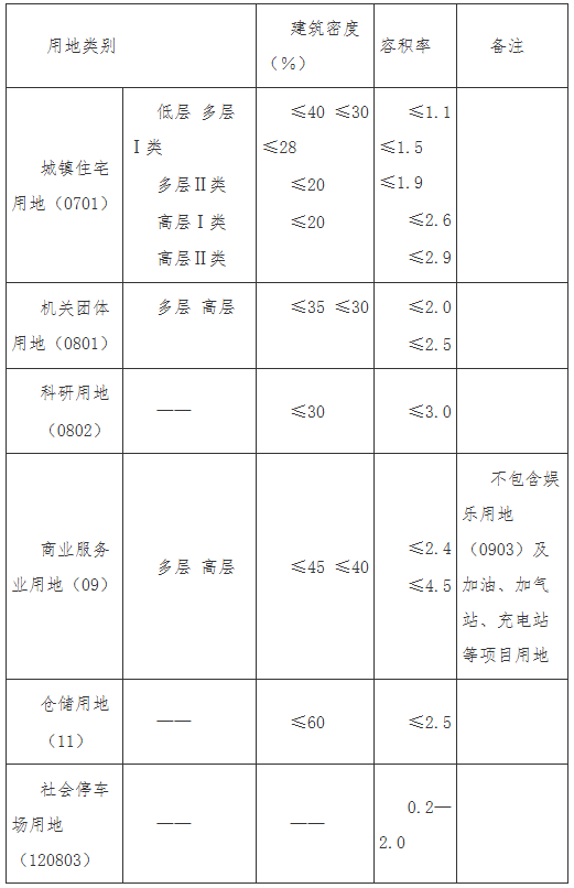 2.本表中未涉及的用地按国家、地方相关规定执行。