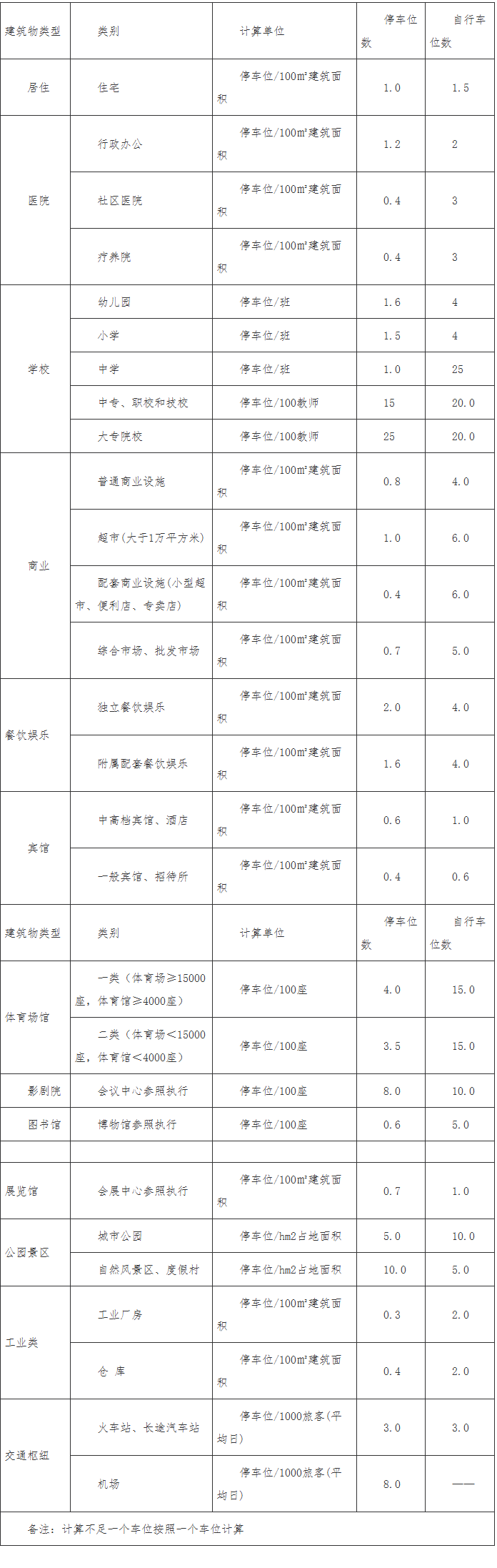 建筑物配建的停车指标除符合国家现行的有关设计标准和规范外,需同时符合附表二《建筑物停车配建指标表》的要求。充电设施配建要求应满足省市相关规定。