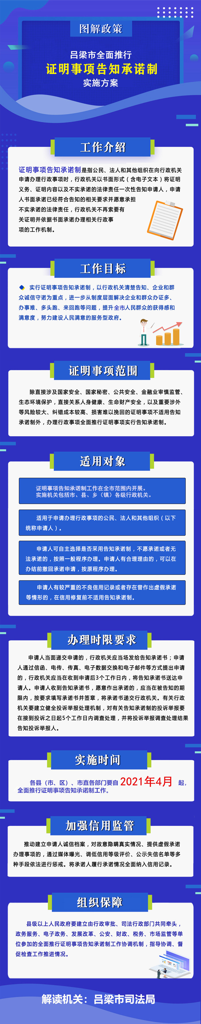 文件链接:吕梁市人民政府办公室关于印发吕梁市全面推行证明事项告知承诺制实施方案的通知