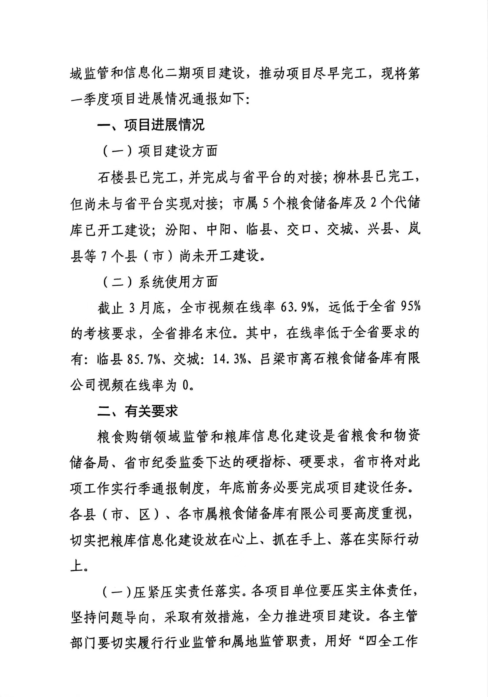 标      题: 关于第一季度全市粮食购销领域监管和信息化二期项目进展情况的通报