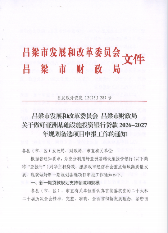标      题: 吕梁市发展和改革委员会吕梁市财政局关于做好亚洲基础设施投资银行贷款2026-2027年规划备选项目申报工作的通知