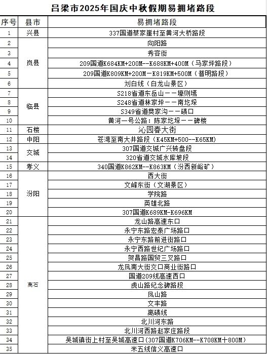 为做好2025年国庆节、中秋节假期期间道路交通安全管理工作,防止发生道路交通拥堵,吕梁市公安局交通管理支队提前发布国庆、中秋假期“两公布一提示”,提醒广大交通参与者合理选择出行时间、出行路线和出行方式,避开出行高峰、易堵路段,安全文明驾驶,平安畅通出行。