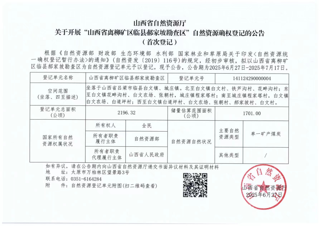 山西省自然资源厅关于开展“山西省离柳矿区临县郝家坡勘查区”自然资源确权登记的公告(首次登记)