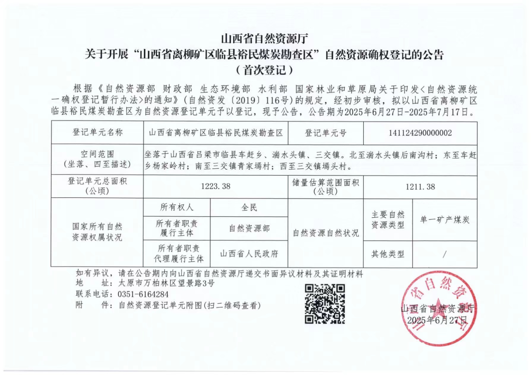 山西省自然资源厅关于开展“山西省离柳矿区临县裕民煤炭勘查区”自然资源确权登记的公告(首次登记)