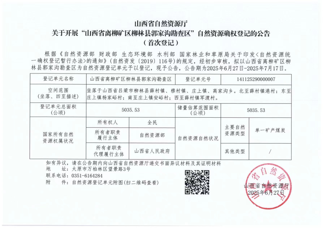山西省自然资源厅关于开展“山西省离柳矿区柳林县郭家沟勘查区”自然资源确权登记的公告(首次登记)