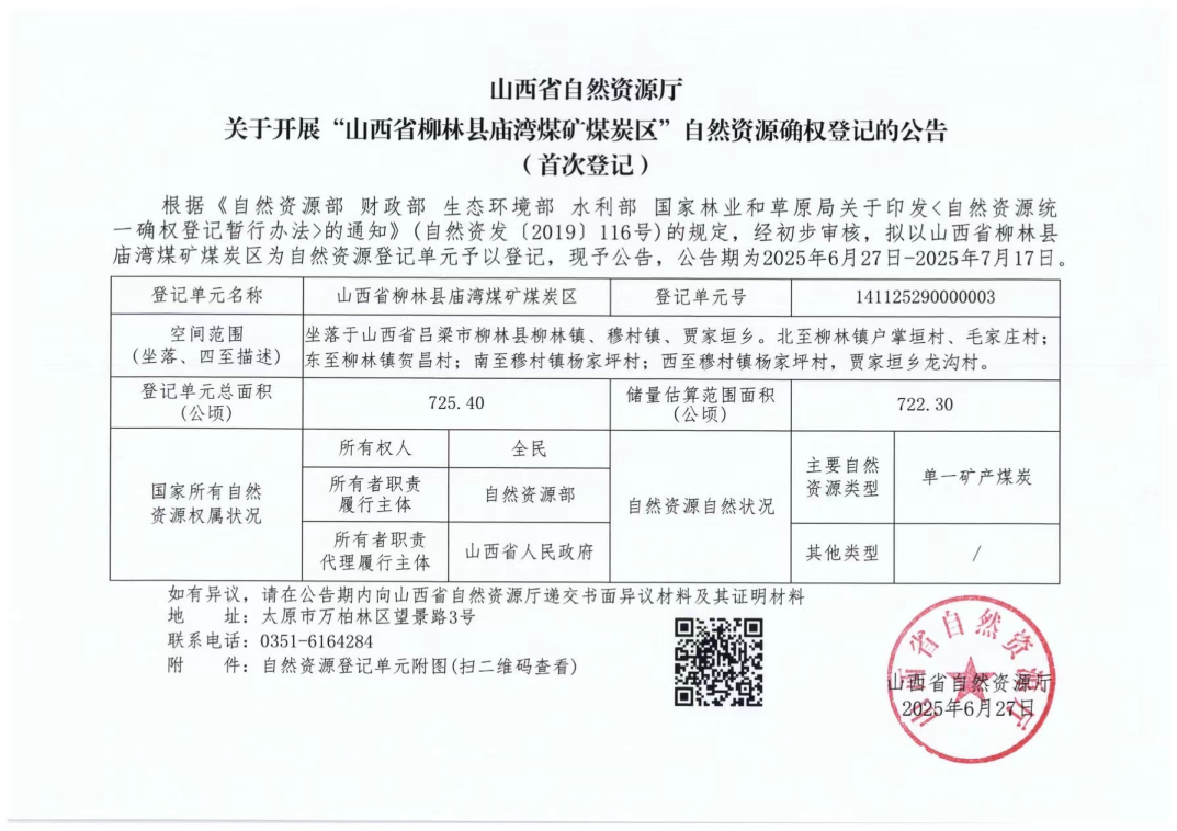 山西省自然资源厅关于开展“山西省柳林县庙湾煤矿煤炭区”自然资源确权登记的公告(首次登记)