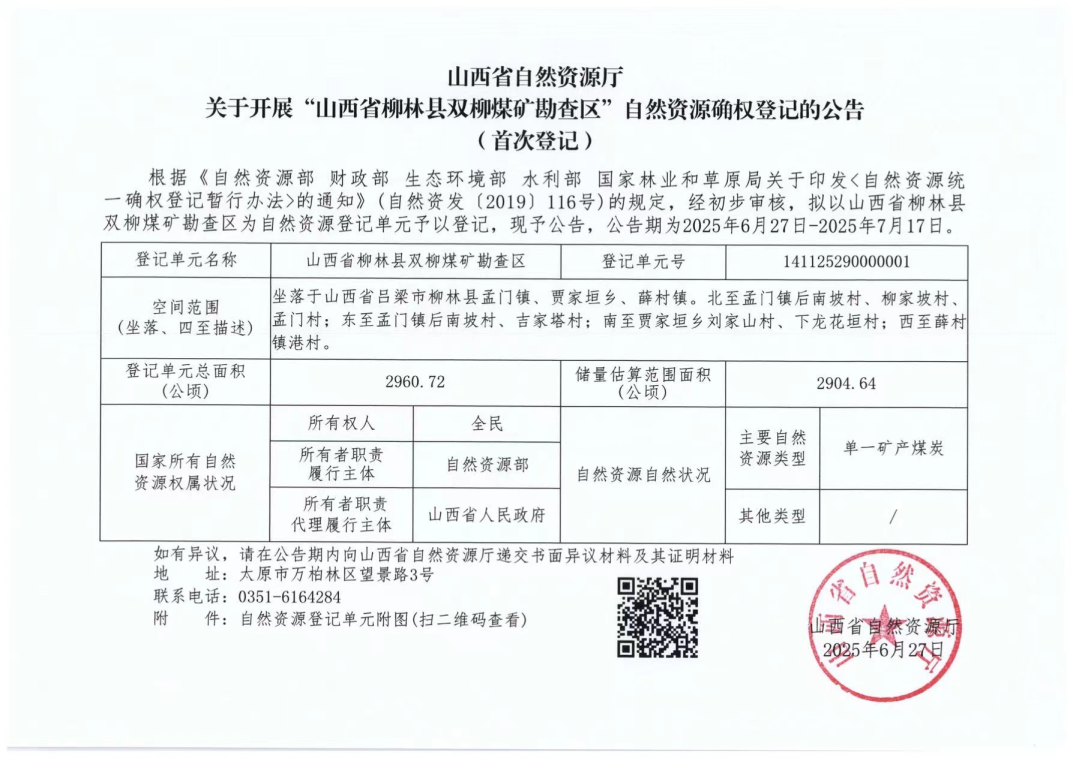 山西省自然资源厅关于开展“山西省柳林县双柳煤矿勘查区”自然资源确权登记的公告(首次登记)