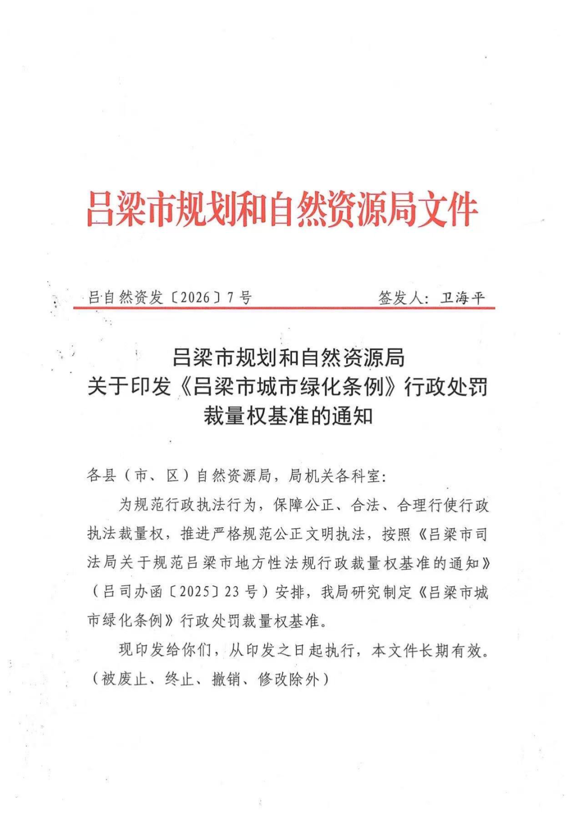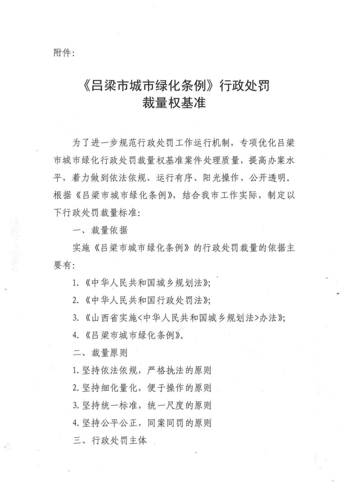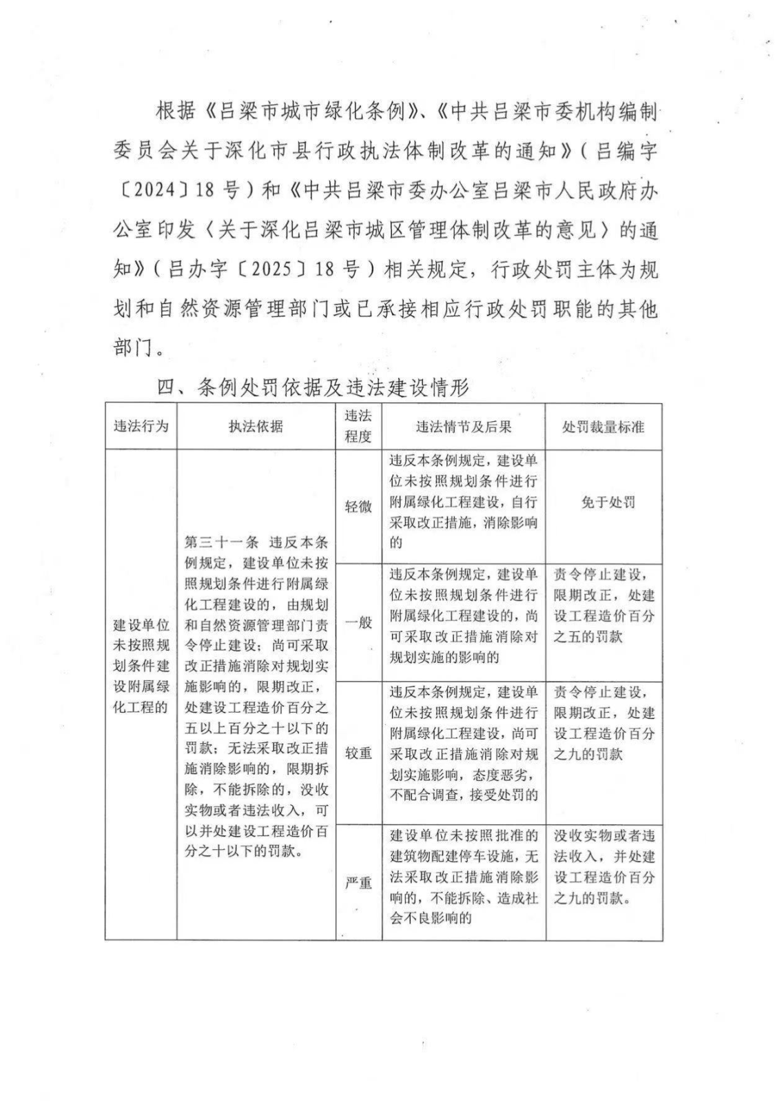 标      题: 吕梁市规划和自然资源局关于印发《吕梁市城市绿化条例》行政处罚裁量权基准的通知