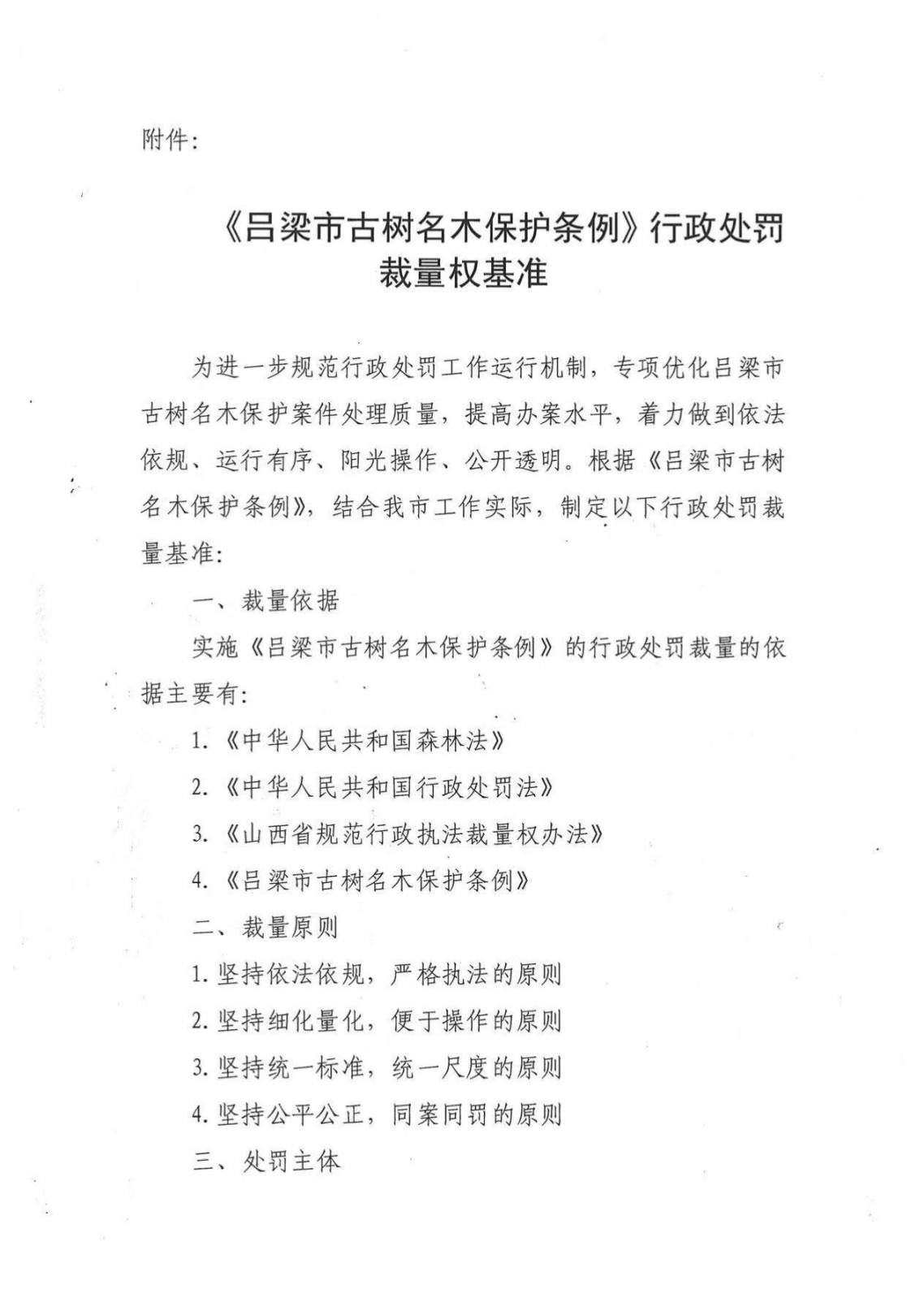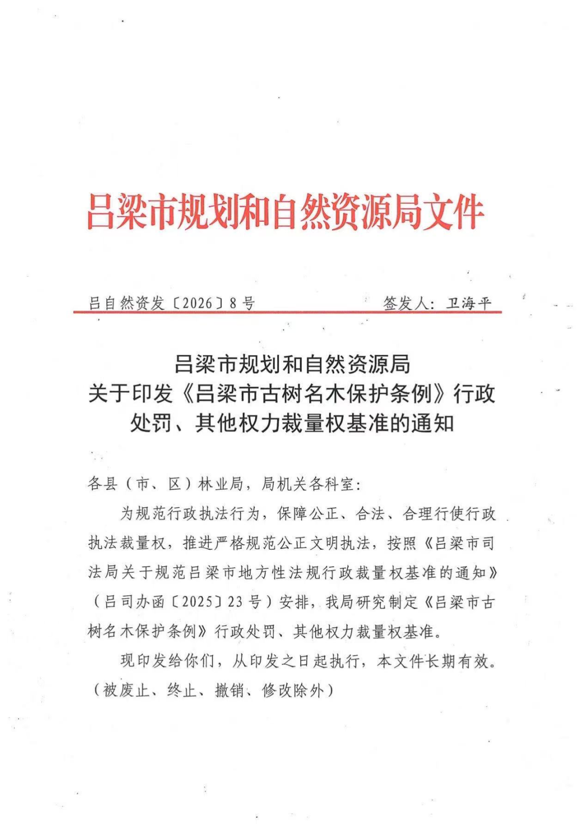 标      题: 吕梁市规划和自然资源局关于印发《吕梁市古树名木保护条例》行政处罚、其他权利裁量权基准的通知