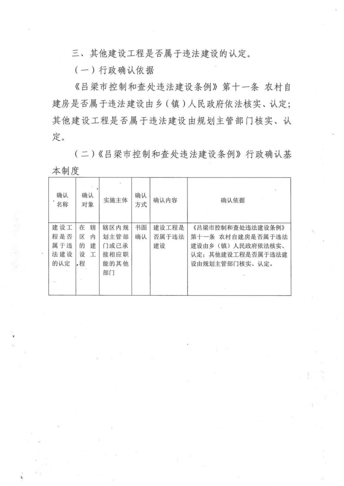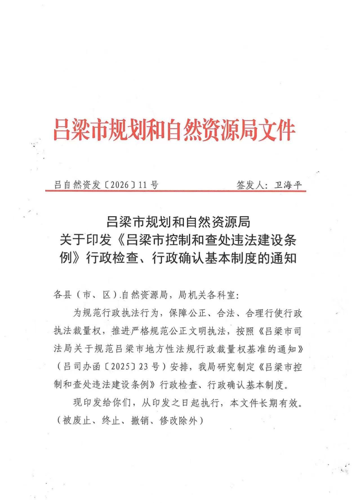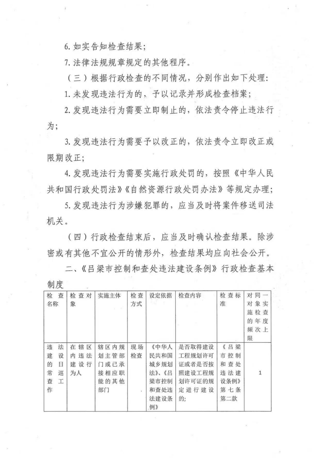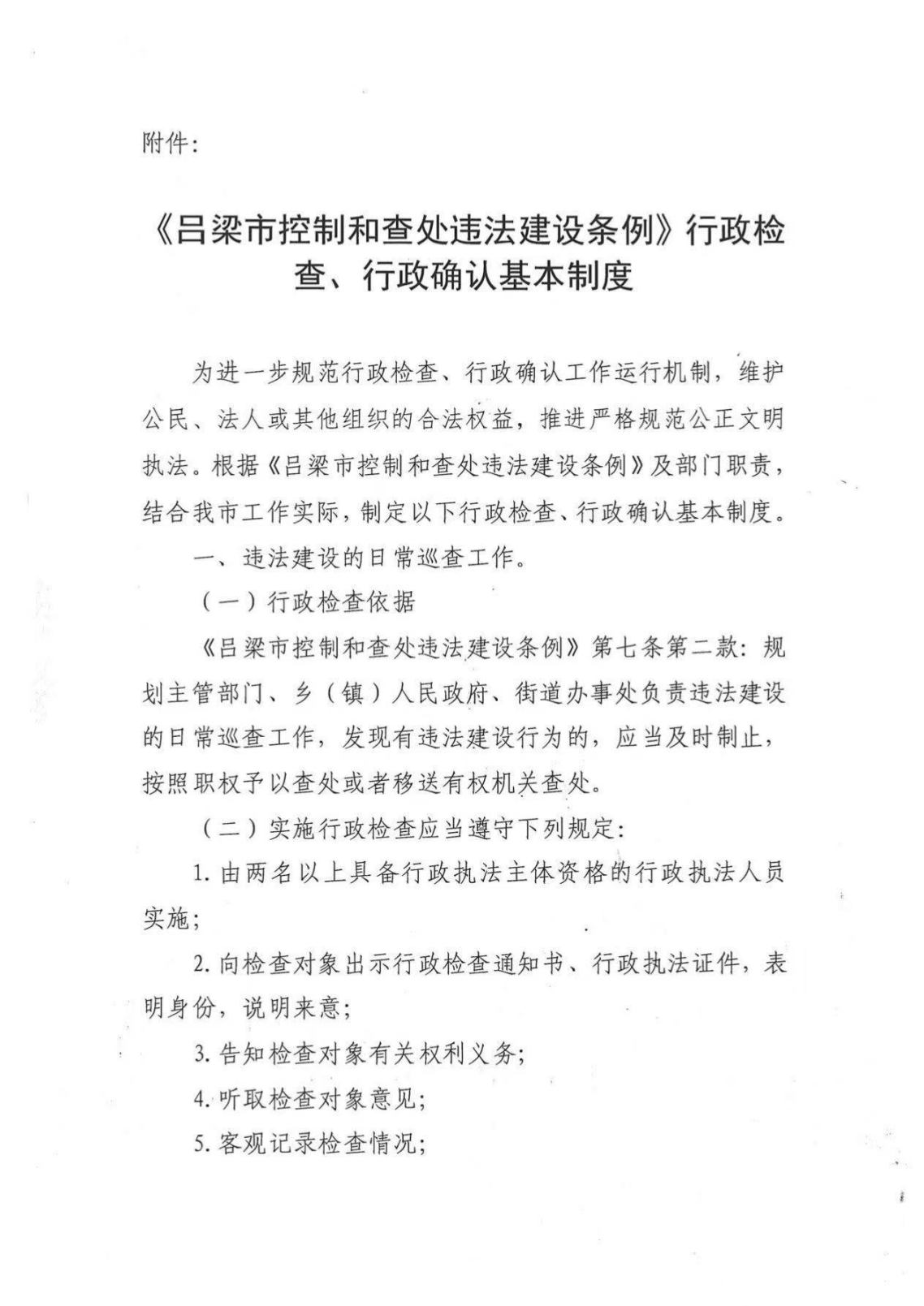 标      题: 吕梁市规划和自然资源局关于印发《吕梁市控制和查处违法建设条例》行政检查、行政确认基本制度的通知