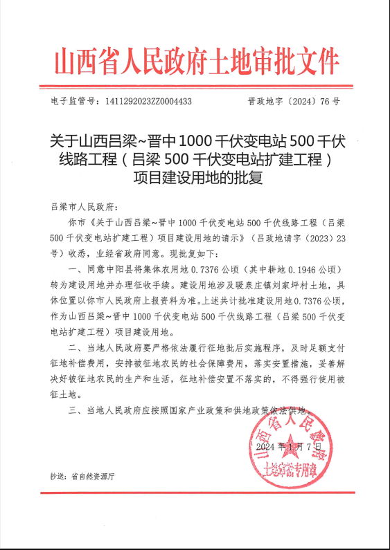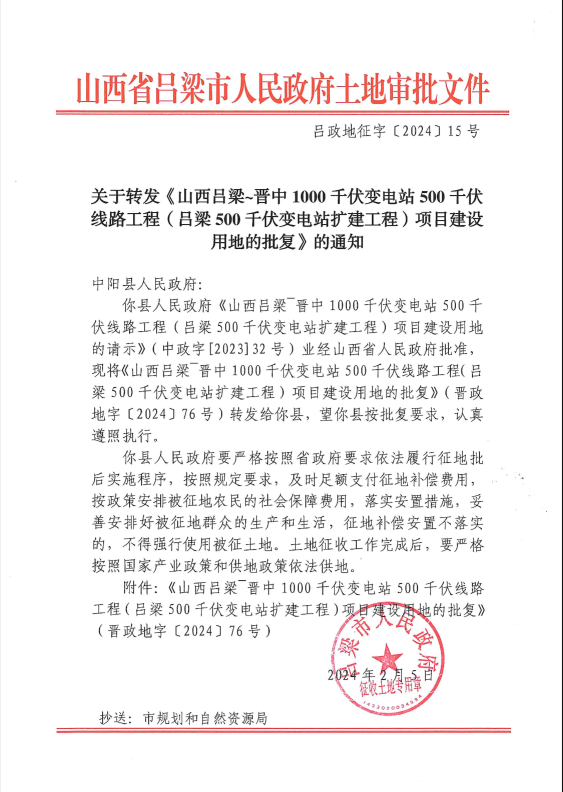 关于山西吕梁~晋中1000千伏变电站500千伏线路工程(吕梁500千伏变电站扩建工程)项目建设用地的批复