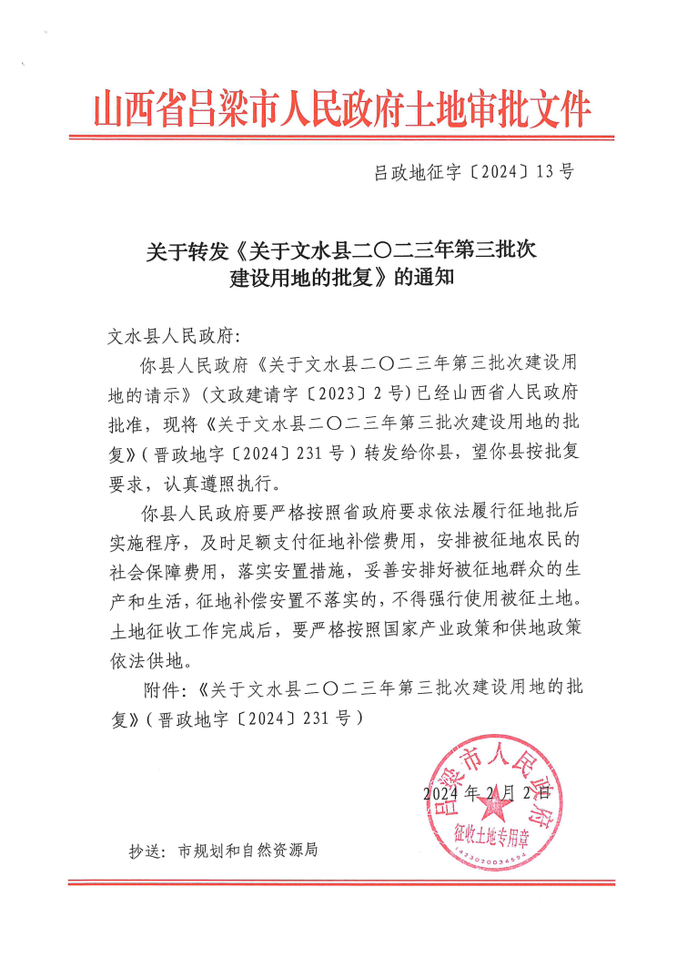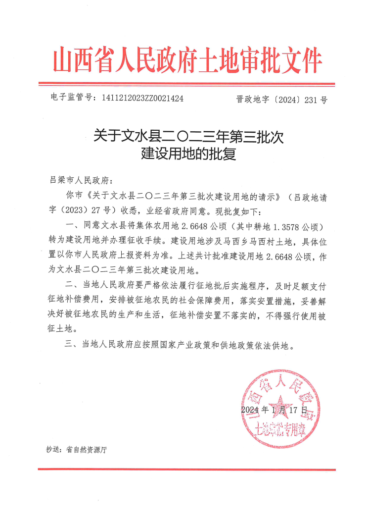 关于文水县二零二三年第三批次建设用地的批复