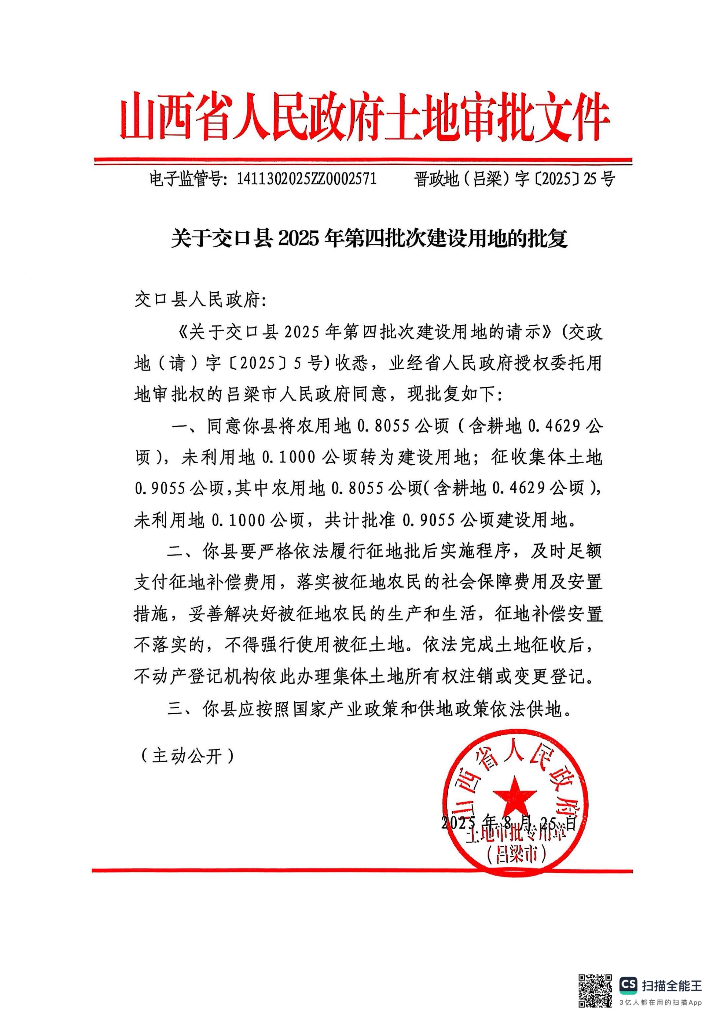 关于交口县2025年第四批建设用地的批复