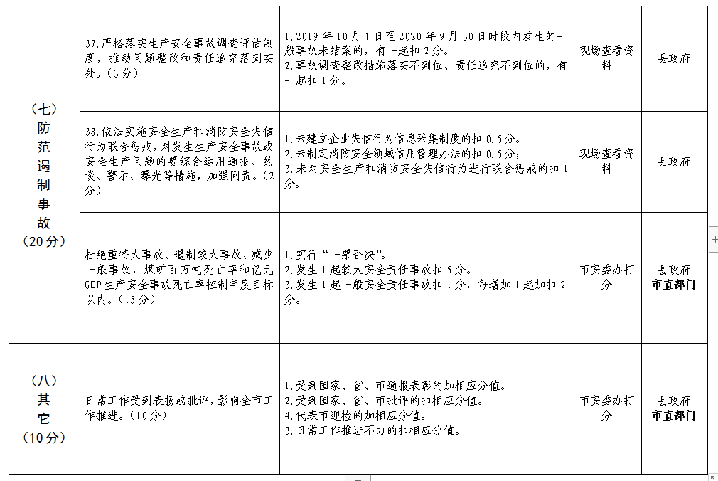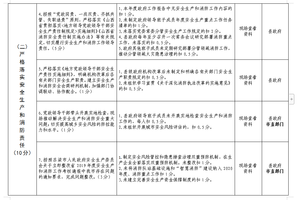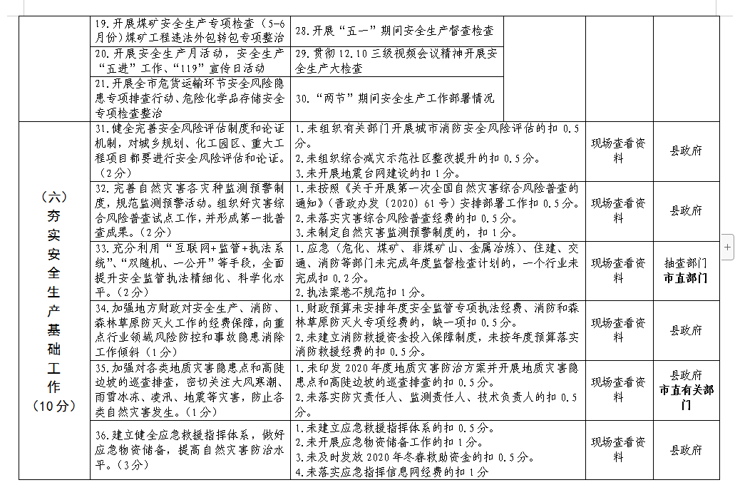 为认真落实省委省政府、市委市政府关于安全生产和消防工作的决策部署,根据吕梁市人民政府《关于做好2020年安全生产工作的通知》、市考核办《各县市区、市直单位专项工作考核办法》(试行)要求,市政府安委会决定开展2020年度全市安全生产和消防工作考核暨山西省“两会”期间安全生产工作督查检查,现将有关事项通知如下: