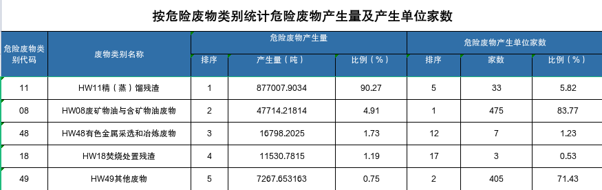 表3 危险废物分类产生量及产生单位情况