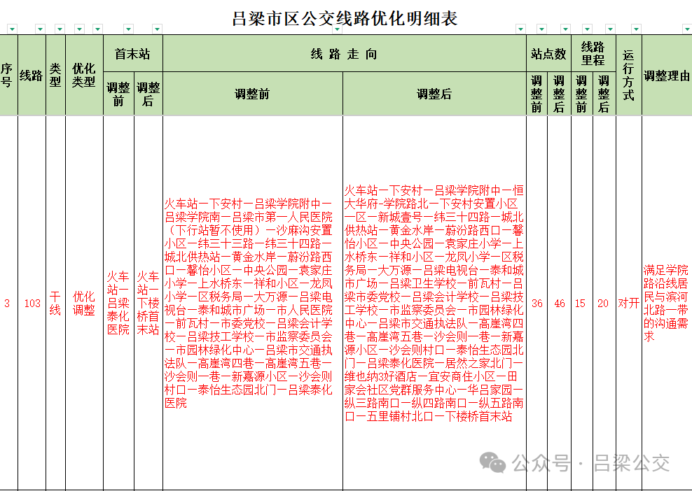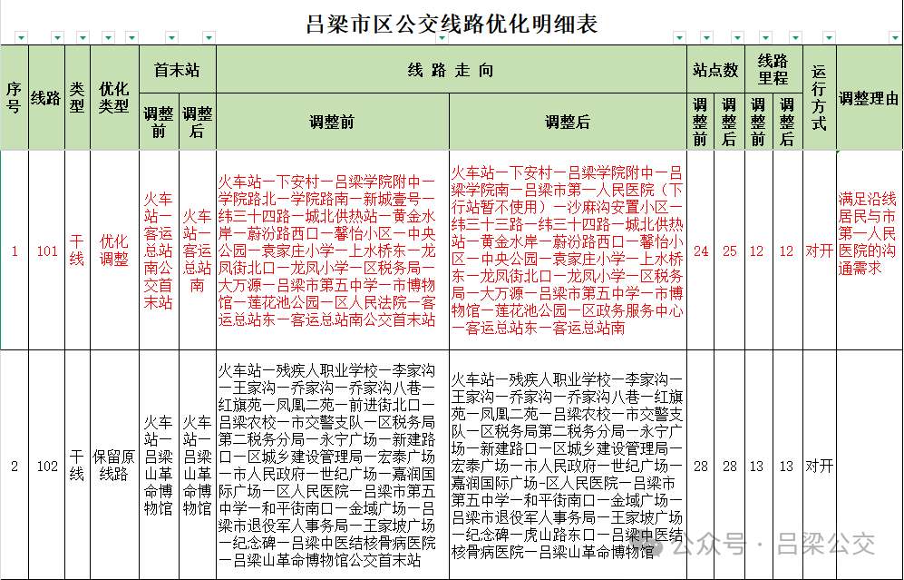 自2022年我市实施“市区公交车全民免费乘坐”政策以来,公交日均客流量已从3.7万人次显著提升至10万人次,公共交通逐渐成为市民出行的首选方式。为进一步提升公交服务质量和运营效率,精准对接城市发展规划与市民出行需求,依据《城市公共交通条例》及《吕梁市公共交通专项规划(2014—2030)》的相关规定及要求,我公司委托专业机构,通过大数据分析、民意调查、座谈交流、意见征集等多种途径,编制完成了《吕梁市城市公交线网优化方案》。现将本次线网优化调整的相关事项公告如下: