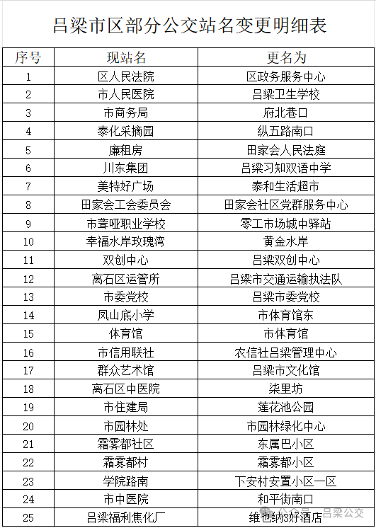 吕梁市区部分公交站名变更明细表