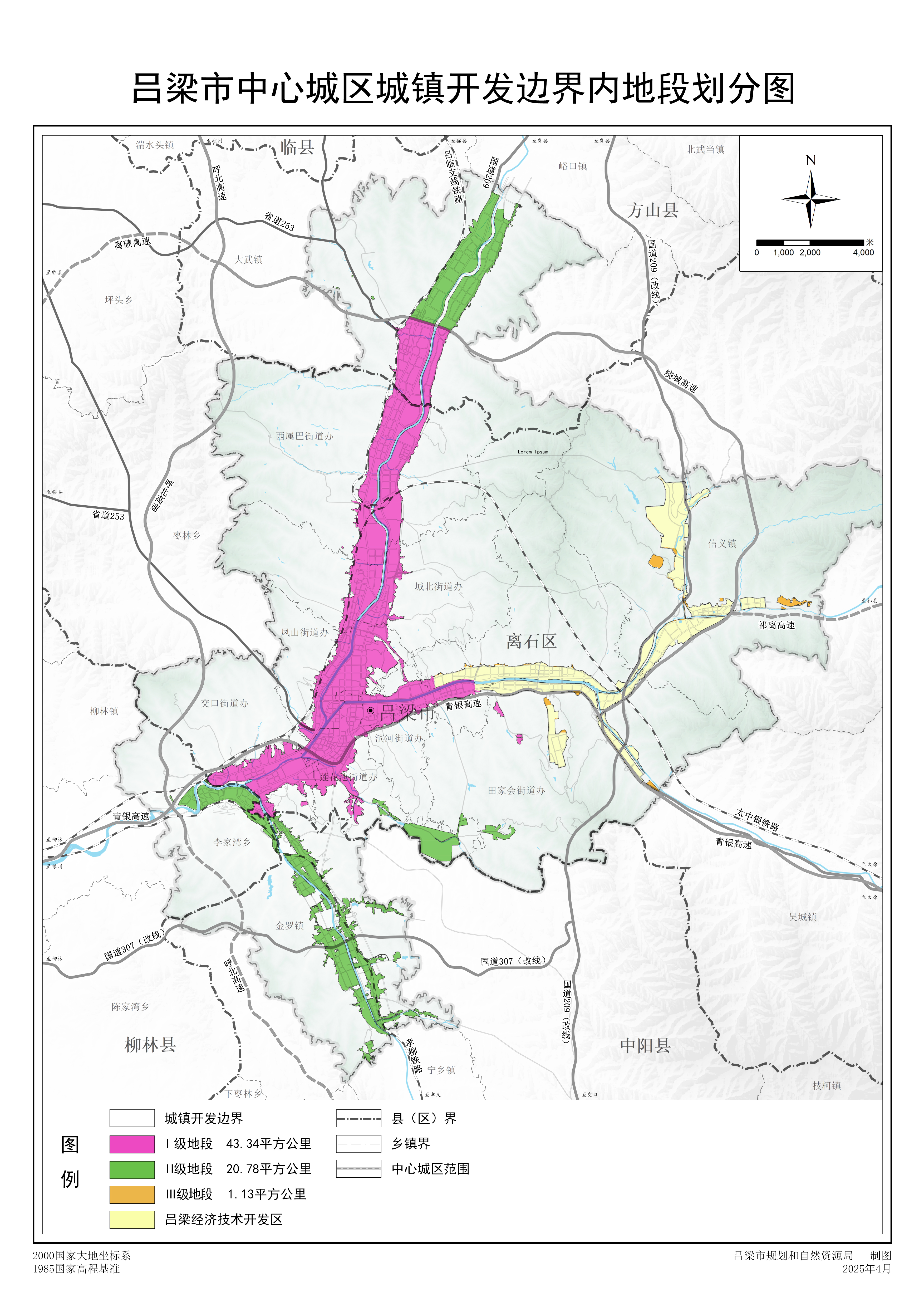 I级范围51.6951平方公里(城镇开发边界内集中连片用地,基础设施覆盖率90%以上区域)。其中,市本级面积43.5320平方公里:东至田家会街道盘龙塔村、木问村,南至交口街道行政边界,西至自然山体边缘,北至吕梁环城高速;吕梁经济技术开发区面积8.1631平方公里:东至田家会车家湾村,南至后北圪垛,西至高崖湾四巷,北至凤山南山脚线。征收标准为70元/m2。