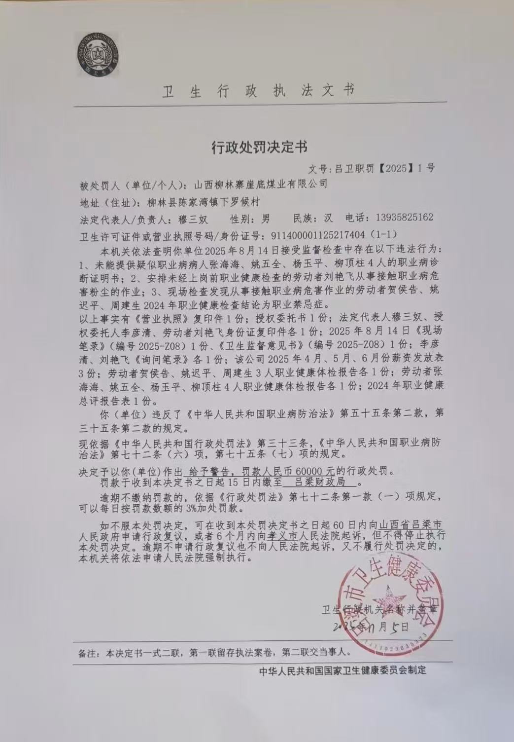 对山西柳林寨崖底煤业有限公司当场行政处罚决定书