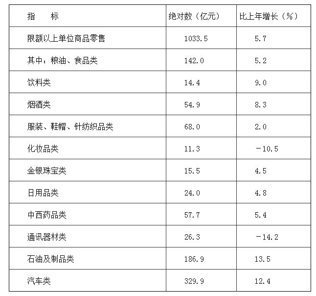 按消费形态分,1-5月份,限额以上单位商品零售额1033.5亿元,同比增长5.7%;餐饮收入71.4亿元,同比增长21.9%。