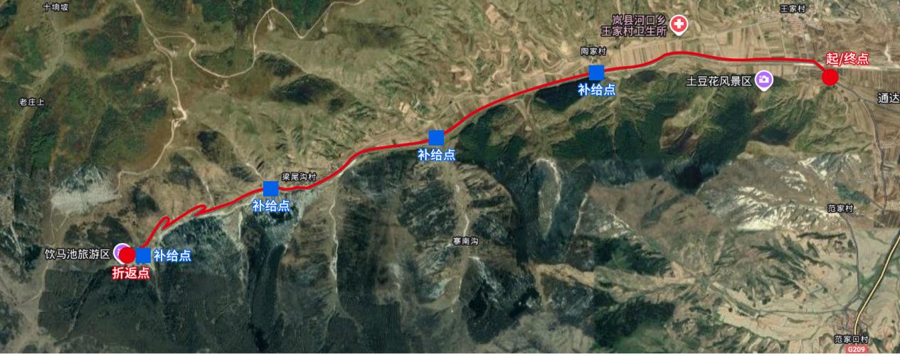 土豆花景区文化长廊(起点)→ 王家村 → 陶家村 → 寨南沟景区 → 梁尾沟村 → 饮马池景区停车场(折返点)→ 梁尾沟村 → 寨南沟景区 → 陶家村 → 王家村→ 土豆花景区文化长廊(终点),全程约16公里。