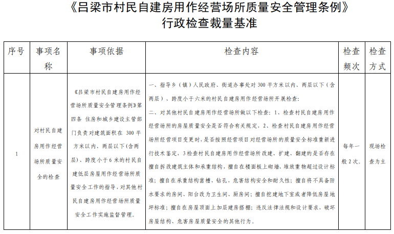 2.《吕梁市村民自建房用作经营场所质量安全管理条例》行政检查裁量基准