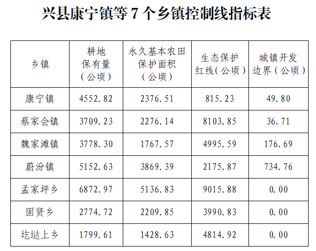 附件:兴县康宁镇等7个乡镇控制线指标表