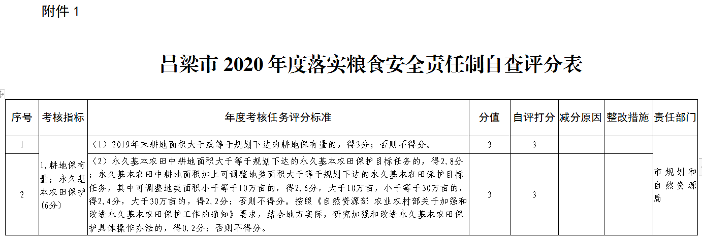 附件:1.吕梁市2020年度落实粮食安全责任制自查评分表