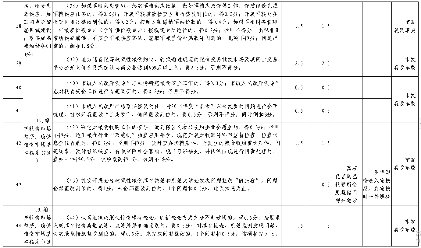 经过对2020年度全市粮食安全责任制考核目标任务所涉6个考核内容27项考核指标全面认真总结和自评打分,满分100分,得分99.356分,扣分0.644分。其中市发改委(粮食和物资储备局)牵头承担的考核项目满分52.5分,得分52分,扣0.5分。扣分项目为:全省政策性粮食库存数量和质量大清查问题整改“回头看”未全部整改到位(1个问题),扣0.5分;市农业农村局牵头承担的考核项目满分27.2分,得分27.2分;市财政局牵头承担的考核项目满分7分,得分7分;市规划和自然资源局牵头承担的考核项目满分6分,得分6分;市水利局牵头承担的考核项目满分2.7分,得分2.556分,扣分0.144分。扣分项目为:一是推进农业水价综合改革未全部完成监审工作,扣0.024分;二是市财政未安排农业水价综合改革资金,扣0.12分;市生态环境局牵头承担的考核项目满分2分,得分2分;市农机服务中心牵头承担的考核项目满分1.5分,得分1.5分;市农村经济管理服务中心牵头承担的考核项目满分0.6分,得分0.6分;市市场监督管理局牵头承担的考核项目满分0.5分,得分0.5分。具体完成情况如下: