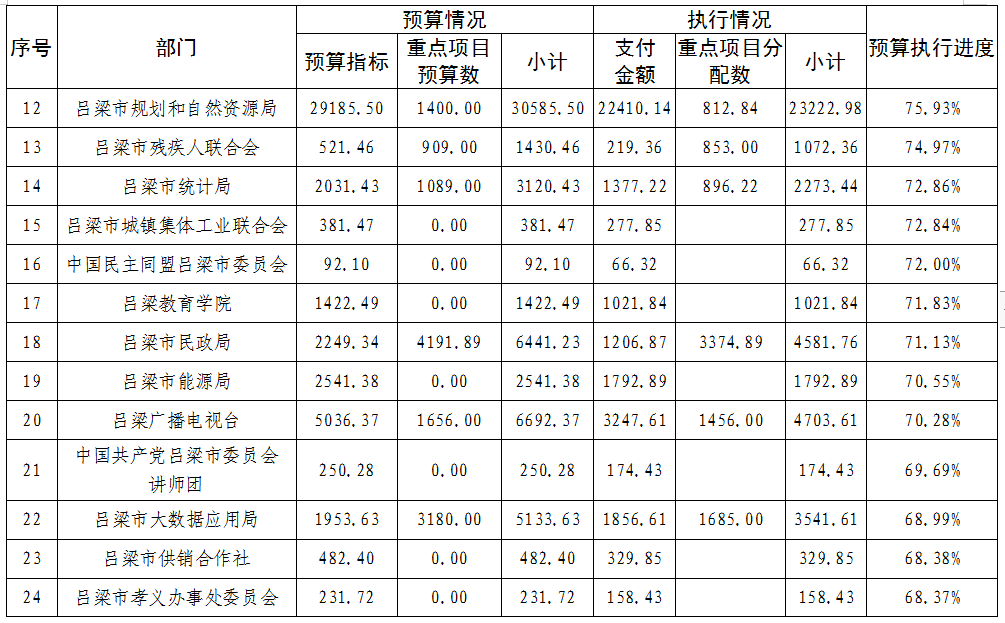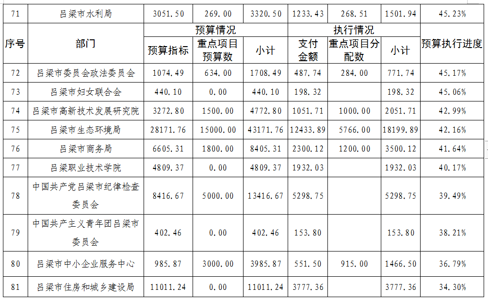 增长5.47%,支出进度为61.11%,差进度4.22个百分点。从各部门预算执行情况看,预算执行达到序时进度的部门有29个,其中排名前五位的部门为:文峪河水利服务中心100%,乡村振兴局94.85%,总工会92.03%,金融工作办公室90.34%,发改委89.5%;其余58个部门预算执行不达序时进度,其中排名靠后的十个重点部门为:市科技局8.4%,市文旅局27.67%,市工信局30.87%,市新区建管中心31.24%,市住建局34.30%,市中小企业中心36.79%,市职业技术学院40.17%,市商务局41.64%,市生态环境局42.16%,市高新研究院42.99%。