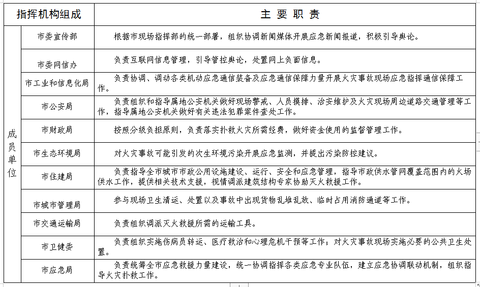 市火灾事故应急指挥部(以下简称市指挥部)下设办公室,办公室设在市消防救援支队,负责日常值守、信息处置(统计、分析、研判、汇总)和调度指挥等工作。办公室主任由市消防救援支队支队长兼任。市指挥部及其办公室、成员单位职责(见附件2)。
