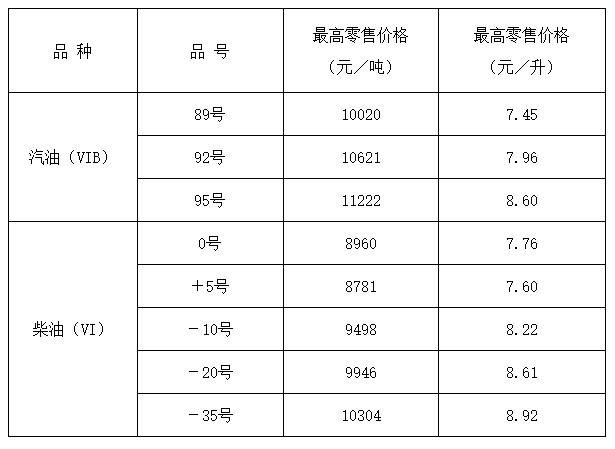 山西省成品油最高零售价格表
