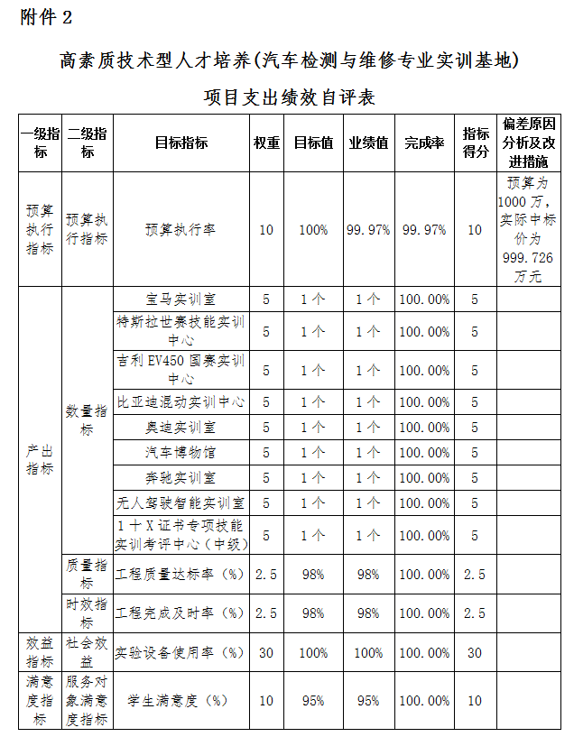 高素质技术型人才培养专项资金(汽车检测与维修专业实训基地建设经费)项目绩效自评综述:根据年初设定的绩效目标,项目绩效自评得分为 99.98分。项目全年预算数为1000万元,执行数为 999.76万元,完成预算的99.98%。项目绩效目标完成情况:项目经2021年9月招标,10月签订合同,同月进场施工,12月验收通过。比亚迪混动实训中心1个;1十X证书专项技能实训考评中心(中级)1个;汽车博物馆1个;奥迪实训室1个;吉利EV450国赛实训中心1个;宝马实训室1个;特斯拉世赛技能实训中心1个;奔驰实训室1个;无人驾驶智能实训室1个共9个实训室。工程质量达标率达98%,工程质量达标率达98%,完全符合合同要求,并经专家组验收能过。