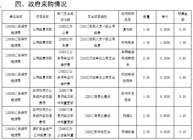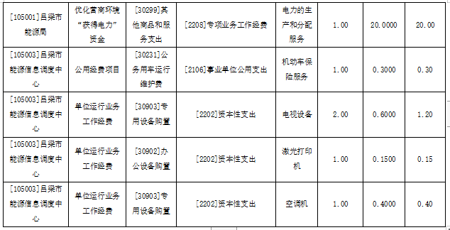 吕梁市能源信息调度中心5个110万元.33:能源信息平台购买服务经费34.67万元、专用机房设备电费34.72万元、煤炭专网信息平台维护及租赁费35.19万元、单位运行业务工作经费1.75万元、安全检查专项工作经费4万元