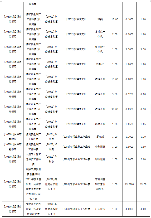 吕梁市能源局17个1210.75万元:能源研究服务经费247.02万元、煤炭工程系列职称评审费2.96万元、煤矿安全生产工作经费40万元、退役军人慰问经费0.35万元、冬季清洁取暖工作经费10万元、公共服务岗位人员经费25.2万元、天然气长输管道保护工作经费10万元、煤矿安全检查租车费10万元、电力行业工作经费5万元、吕梁市煤炭消费总量控制2021年度自查报告及2022年实施方案15万元、节能领导组办公室工作及宣传培训经费10万元、优化营商环境获得电力资金20万元、异地干部交流房屋租赁费1.5万元、政府协同办公系统升级改造费用10.5万元、2021年非常规天然气中央财政奖补资金24.13万元、2022年非常规天然气省级奖补资金326.3万元、2022年清洁能源发展专项资金452.79万元。