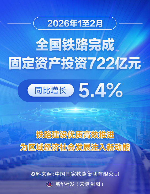 记者3月11日从中国国家铁路集团有限公司获悉,2026年1至2月,全国铁路完成固定资产投资722亿元,同比增长5.4%,铁路建设优质高效推进,为区域经济社会发展注入新动能。