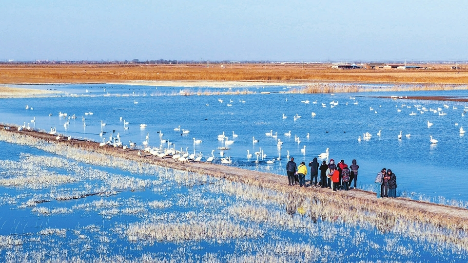 每年10月下旬至次年3月是永济市伍姓湖湿地最佳观鹅时间,成群的白天鹅在此栖息觅食,吸引众多市民前来观赏,构成一幅人与自然和谐共生的温馨画卷。程永仁摄